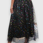Falda elegante y larga con un divertido patrón de lunares y un diseño de malla fluido. Perfecta para atuendos elegantes en cualquier temporada.