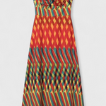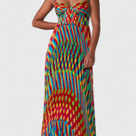Una obra de arte en movimiento. El vestido Janis fusiona un estampado geométrico pintado a mano con una silueta A-line fluida para un efecto cautivador. Su escote halter con forma de corazón y detalles fruncidos en la cintura añaden definición femenina y un aire de sofisticación refinada.