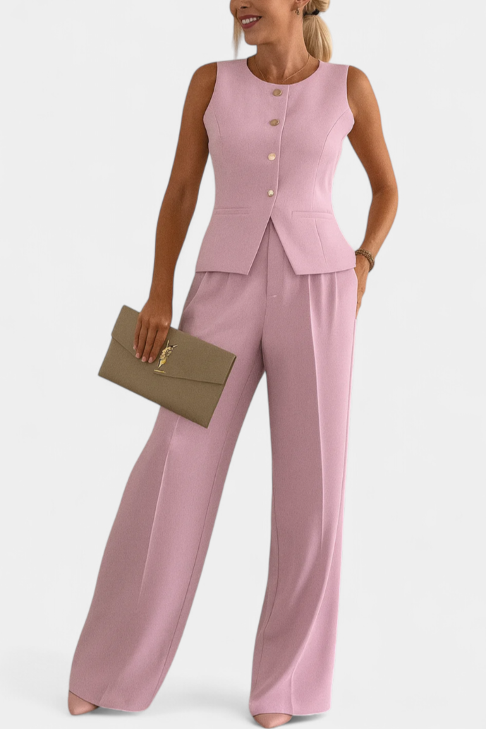 Sencillo, refinado y cómodo, el conjunto Paloma une una blusa sin mangas con botones y un pantalón fluido de corte favorecedor. Diseñado para ofrecer estilo sin esfuerzo, es perfecto para un almuerzo relajado, una tarde en la ciudad o una cena al aire libre.